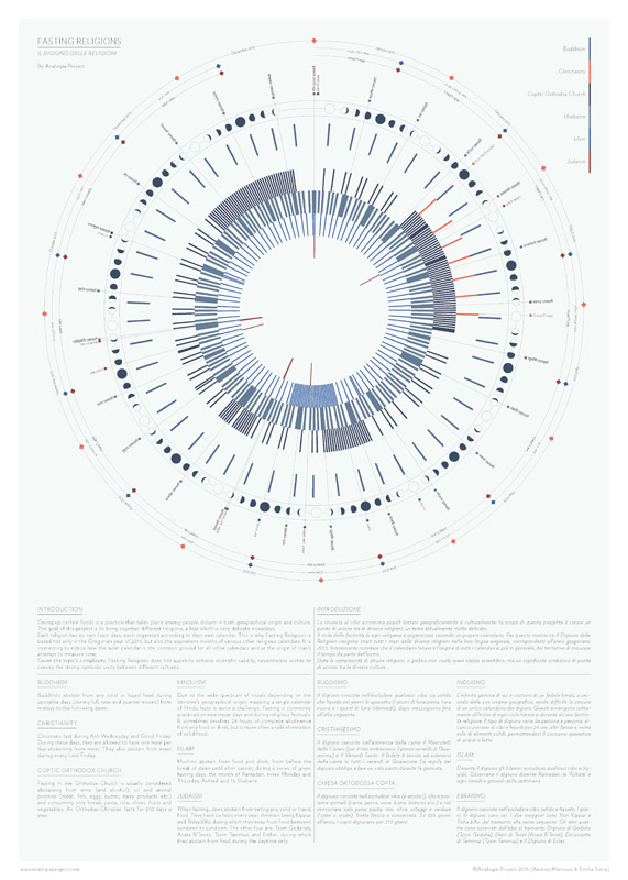 Il ciclo delle festività di ogni religione è organizzato secondo un proprio calendario. Per questo motivo ne Il Digiuno delle Religioni vengono citati tutti i mesi delle diverse religioni nella loro lingua originale, corrispondenti all’anno gregoriano 2015. Interessante ricordare che il calendario lunare è l’origine di tutti i calendari e, più in generale, del tentativo di misurare il tempo da parte dell’uomo.