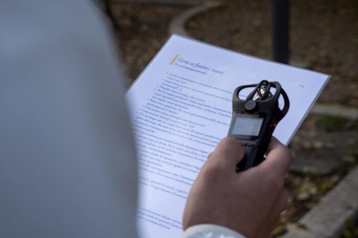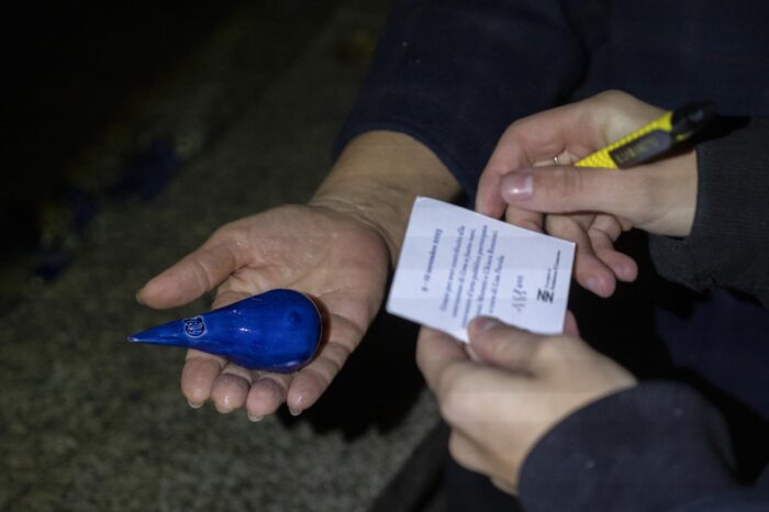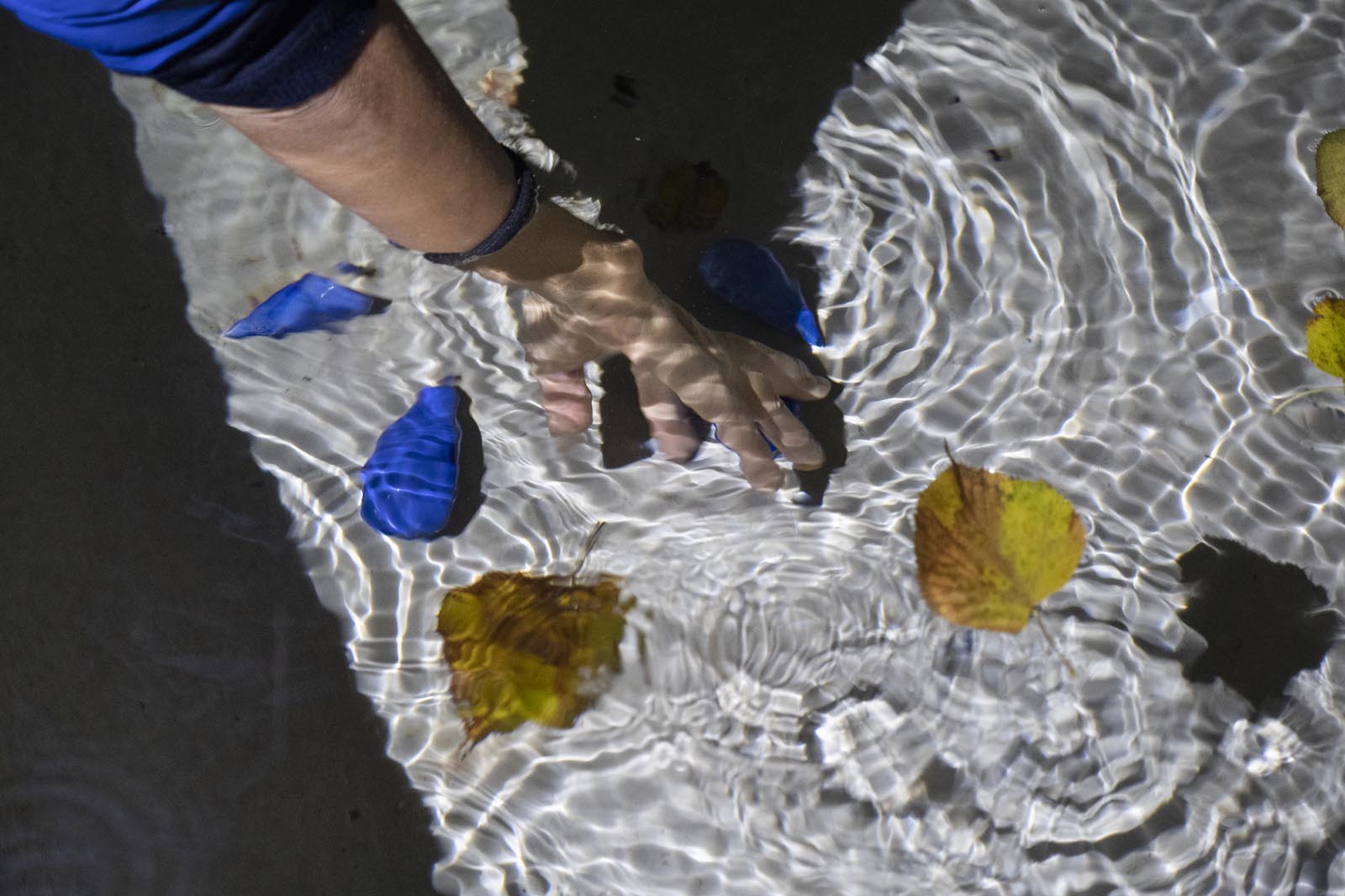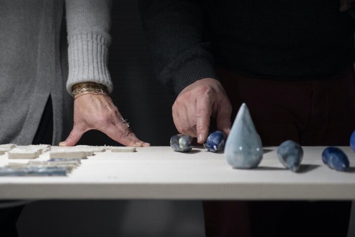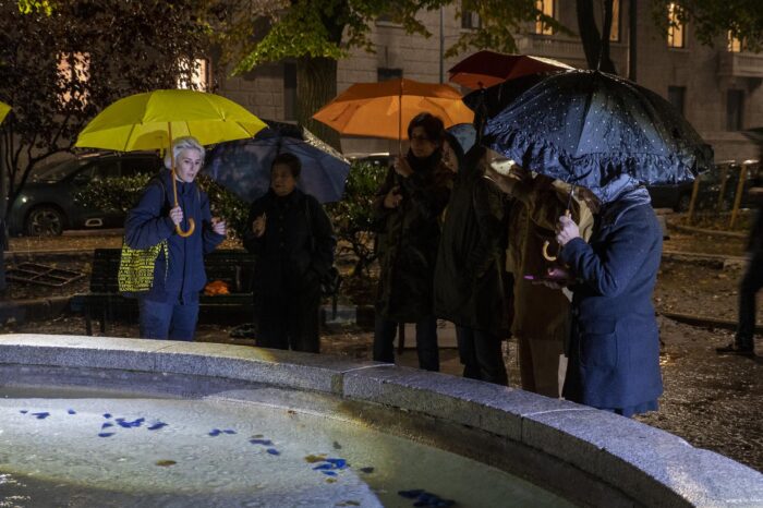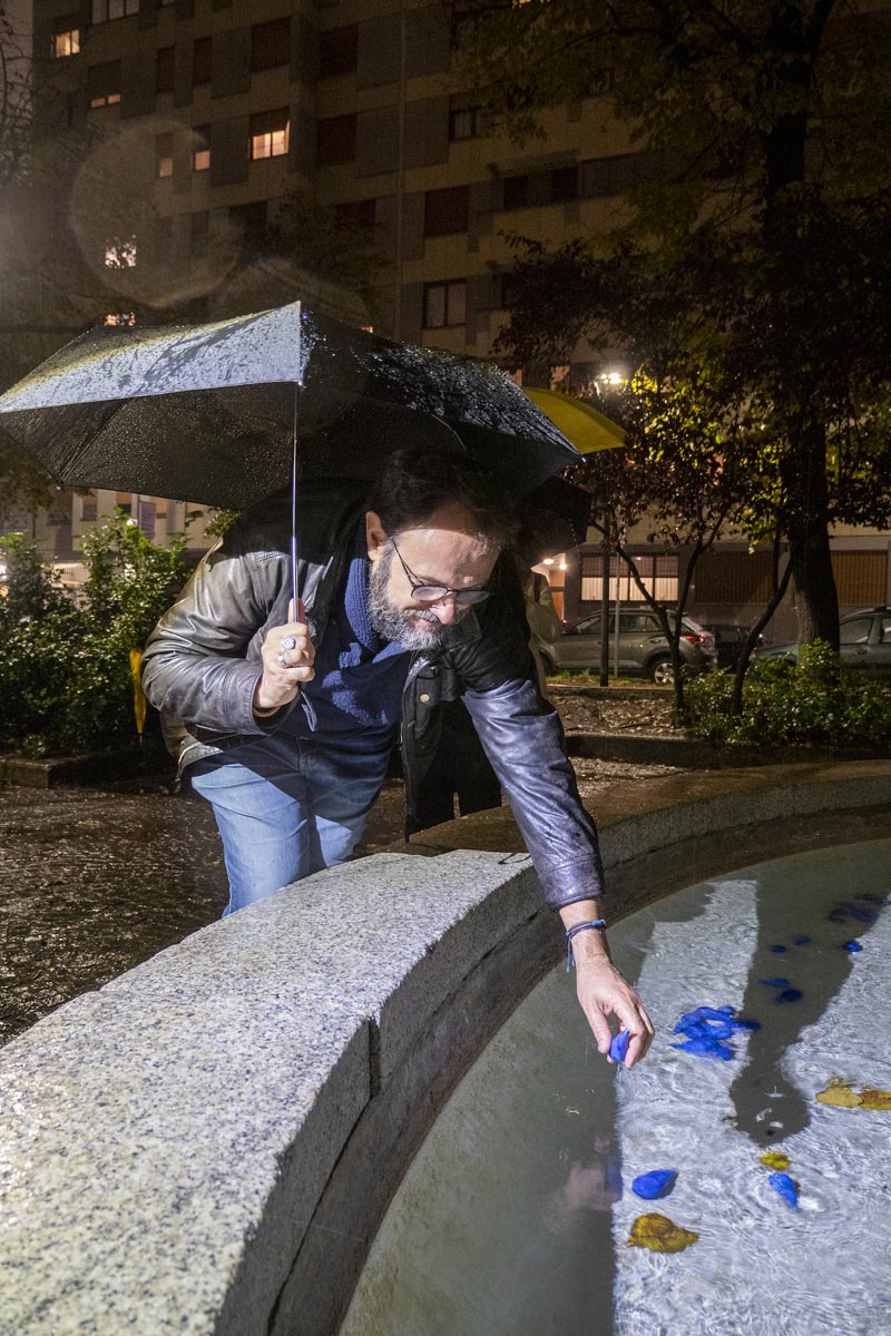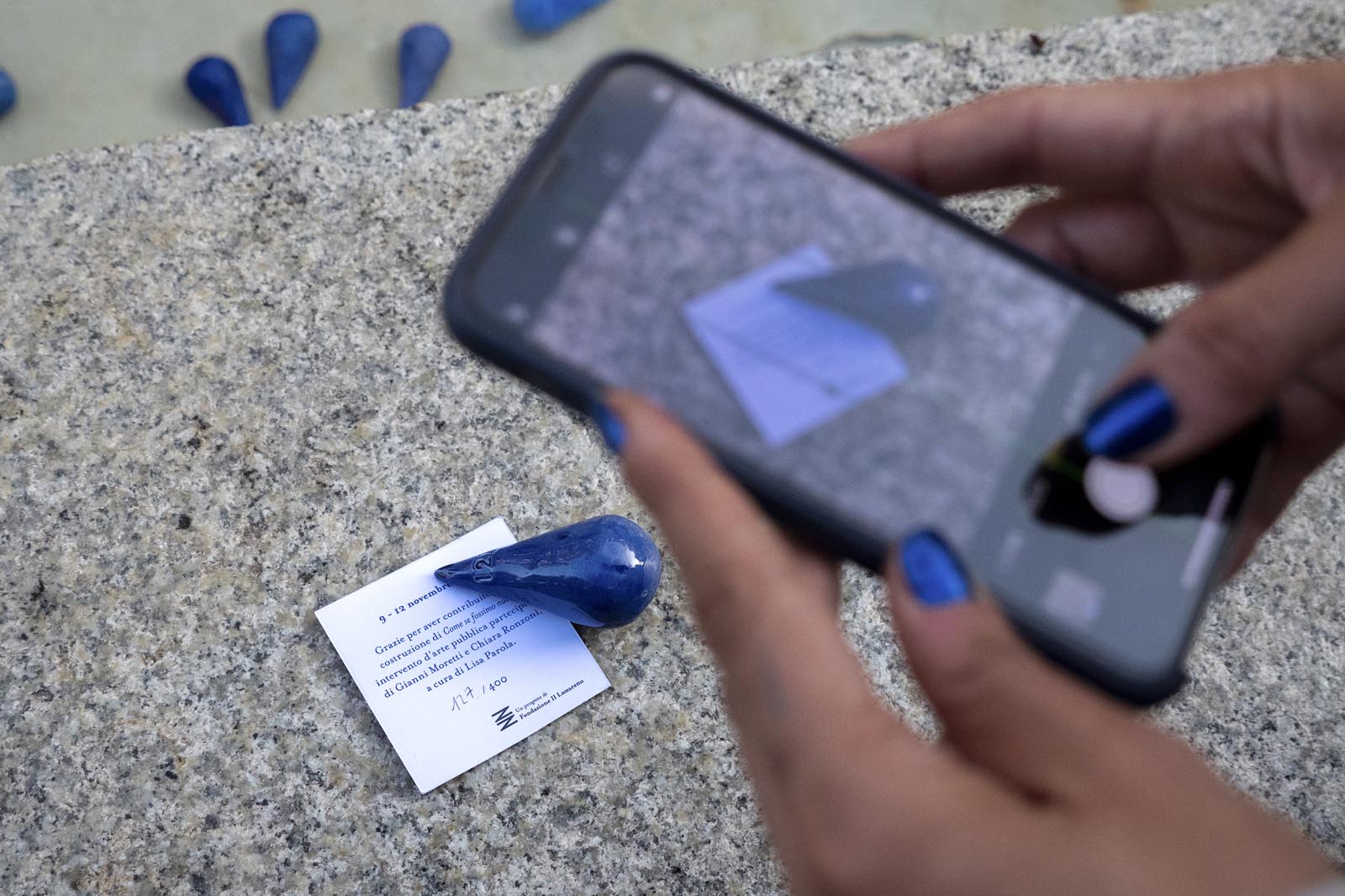 Nella prima fase – che ha avuto luogo durante il Festival – centinaia di lacrime in ceramica blu sono state adagiate sul fondo della fontana in attesa di un gesto; quattrocento pezzi unici realizzati a mano dalla ceramista Claudia Barana – ranaba. Le lacrime, immerse e visibili attraverso la superficie dell’acqua, sono state raccolte, con cura e attenzione, dai partecipanti e trasformate in parole o pensieri che risuonano dentro quando si pensa alla separazione e alla mancanza. Queste parole sono state registrate attraverso i device collocati in prossimità dell’opera.