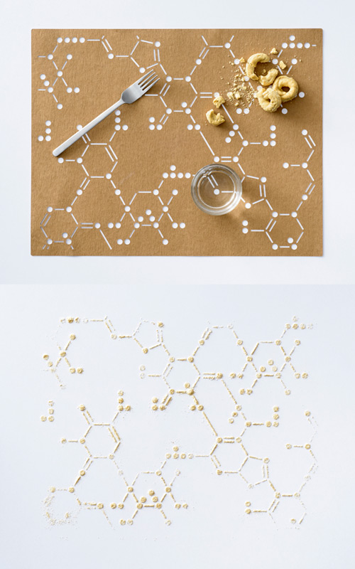 Mollicola, è un progetto di tovaglietta monoposto, bucherellata secondo un disegno preciso: infatti la superficie restituisce attraverso la sequenza di fori una molecola di amido, un carboidrato presente e contenuto nella maggior parte degli alimenti come pane, pasta, riso, patate, etc.