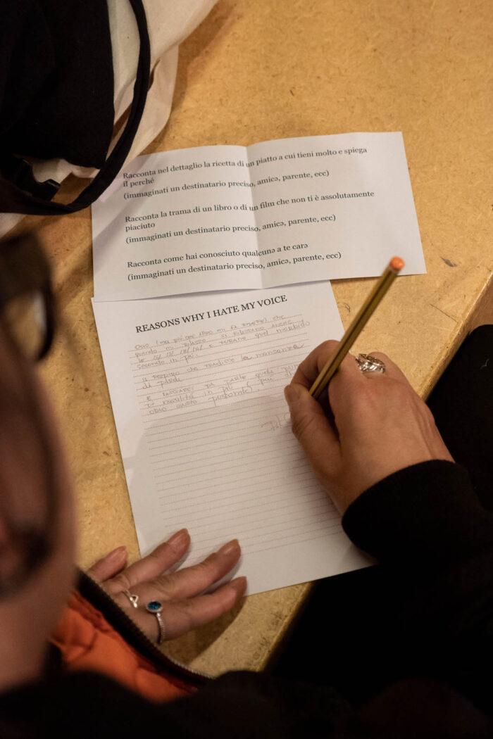 Reasons why I hate my voice nasce dalla ricerca condotta da giulia deval per la scrittura di PITCH, performance lecture sul ruolo dell’intonazione vocale nella comunicazione umana e non umana e stimola una riflessione collettiva sul mezzo stesso delle nostre conversazioni. Questa ricerca è la vincitrice del Premio Lydia 2024, promosso da Fondazione Il Lazzaretto e curato da Claudia D’Alonzo, con il contributo della Fondazione Lydia Silvestri e in collaborazione con il PAC Padiglione d’Arte Contemporanea.