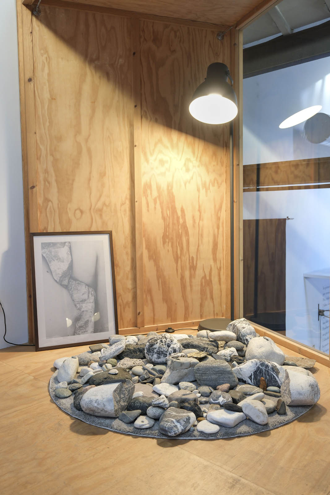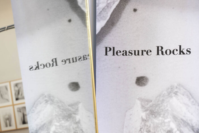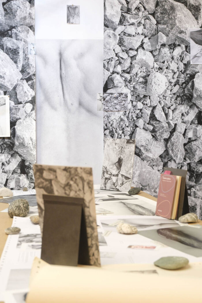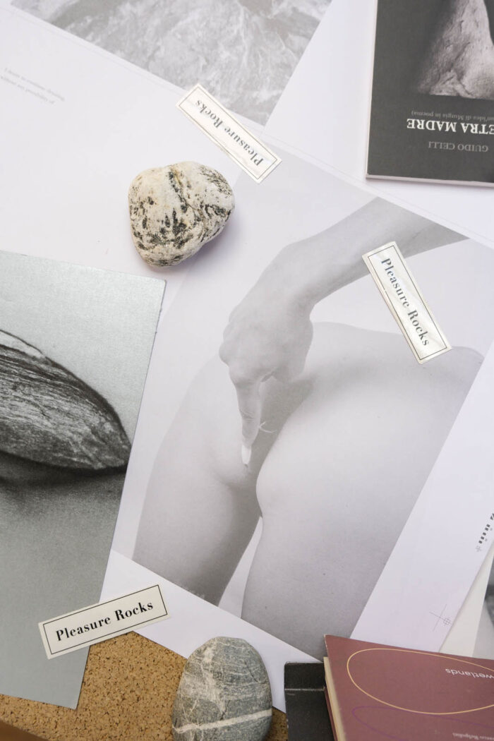L’installazione – visibile durante l’opening di mercoledì 5 novembre e sabato 8 novembre – è pensata per essere un luogo in cui sostare, guardare, sfogliare e entrare in relazione con l’immaginario creato da Pleasure Rocks. Un luogo che ripropone i primi passi della ricerca, quando corpi umani e corpi di pietra iniziavano a incontrarsi nel ribaltamento del concetto di piacere e potere.