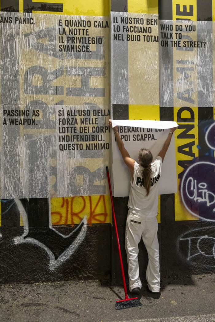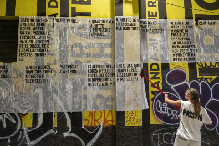 Nell’indagine sul binomio Potere/Piacere, Sara Leghissa invita i passanti a interrogarsi sulla percezione del proprio corpo nello spazio pubblico e sui dispositivi e movimenti di autodifesa, attraverso un’affissione per lo spazio pubblico nella zona di Porta Venezia.