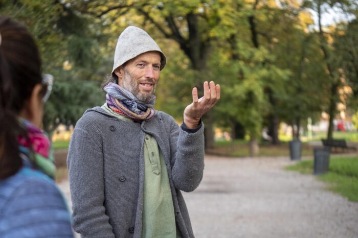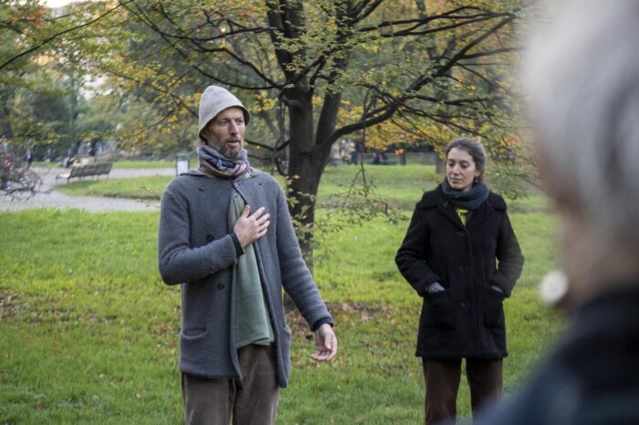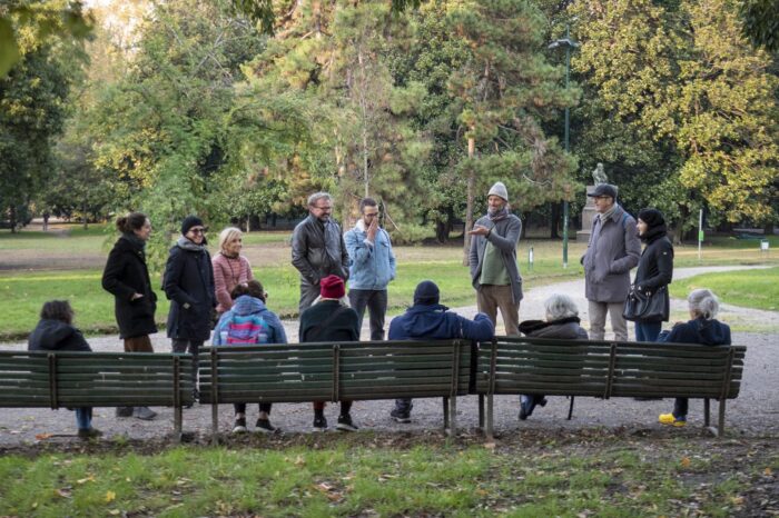 Vagabondare come forma di esercizio all’ascolto. Durante il Festival abbiamo trascorso un pomeriggio per sperimentare nuove forme del camminare, di vivere l’attorno, di spaesare i sensi per risvegliare nuovi modi di guardare. L’artista Andrea Mori, bighellonatore per professione, ha condotto il gruppo in una passeggiata nel Parco di Porta Venezia di cui gli eventi climatici di questa estate hanno trasformato il paesaggio. Dagli alberi caduti apprendiamo la capacità di saper accogliere ciò che accade senza giudizio, custodendone la memoria.