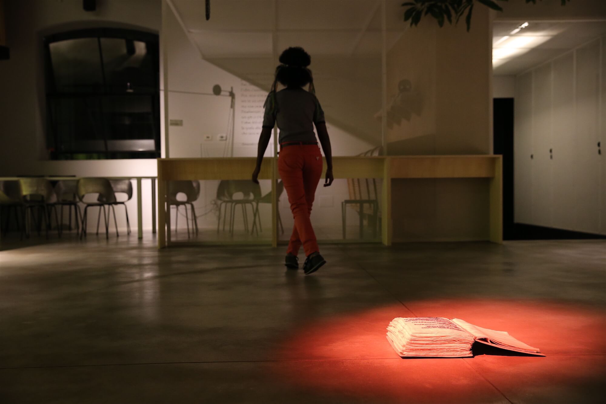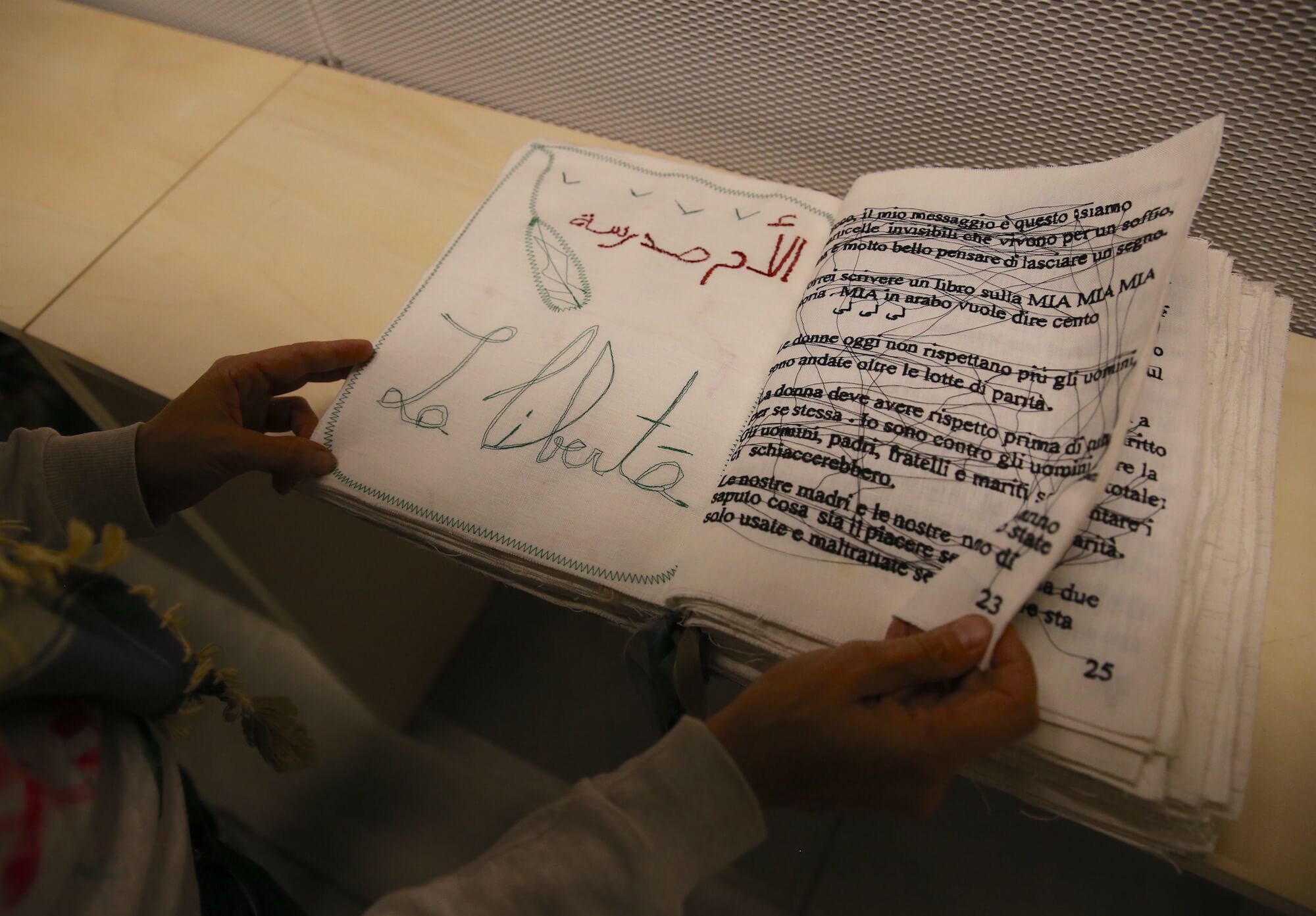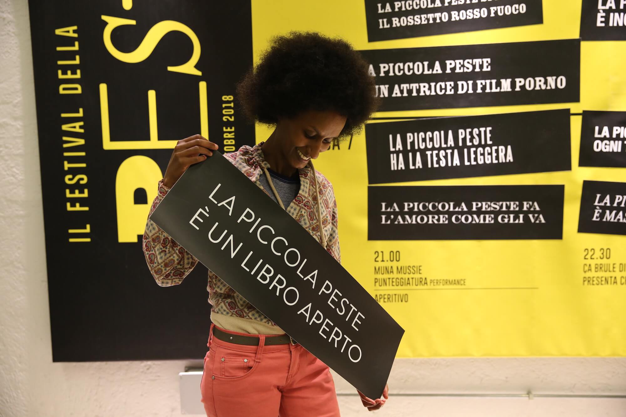 La lingua come spazio politico-affettivo e come materiale estetico è alla base dell’opera di Muna Mussie – artista nata in Eritrea e residente a Bologna. L’artista concepisce la creazione collettiva di un libro di stoffa, considerandolo come un vero e proprio luogo, un “tessuto sociale” che si costruisce grazie al dialogo con un nucleo di donne di differenti provenienze. Mussie ha aperto i dialoghi ponendo come centro tematico il libro e ogni donna è stata libera di rispondere alle domande o di trattare argomenti propri. Ognuna rispondendo di sé permette di fare luce sull’altra, di interrogarla, spiegarla, parafrasarla, contraddirla, chiamarla, accompagnarla. Punteggiatura è una creazione immaginaria attraversata dalla lingua, dal filo di un discorso emotivo, gestuale e funzionale alla nascita della cosa comune. È un discorso che si mette in pratica, si autotraduce in ricamo, entra in dialogo con la manualità, la manodopera, agisce e maneggia pensieri, traccia le sue coordinate, le cuce. Quello che viene proposto per il Festival “Peste” è una tappa ulteriore del libro, espressione di una certa femminilità e di presa di parola, di singolarità al plurale, di inclusione/reclusione, di posizionamento ma anche di riposizionamento costante dell’oggetto stesso; il libro infatti, a secondo di come viene consegnato, cambia prospettiva, si deforma, si auto infetta, produce tossine e anticorpi parlanti, visionari e motori.