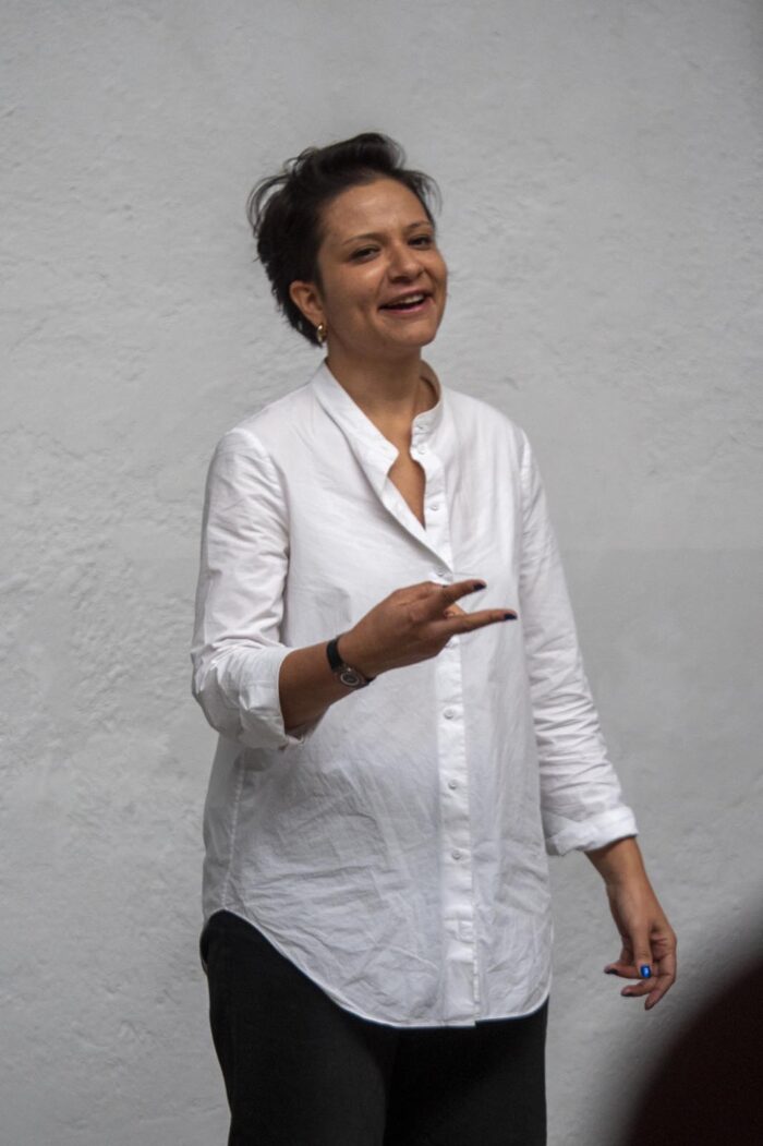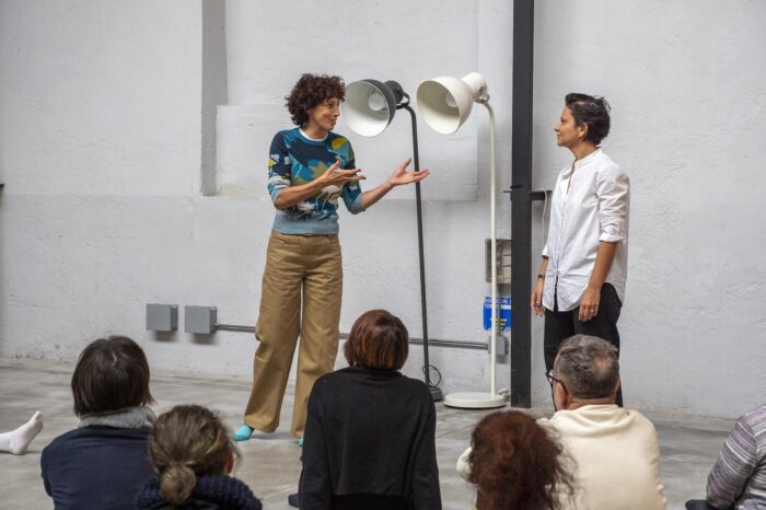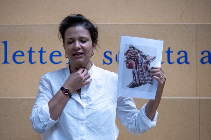 Insieme a Paula Carrara ci siamo addentrati nel campo della anatomia e del pensamento sulla voce attraverso pratiche che esplorano gli spazi all’interno e tra ogni corpo; le connessioni tra struttura, respirazione e risonanza; i percorsi che portano dall’aria alla condivisione del pensiero. Un andare in cerca di ciò che più ci rassomiglia ma che non sempre sentiamo nostro. Un esercizio sul sentire dall’interno, sulla connessione con l’altro sulle geografie – intime e collettive – che creiamo modulando l’aria con il nostro corpo.