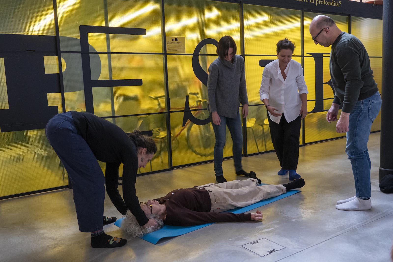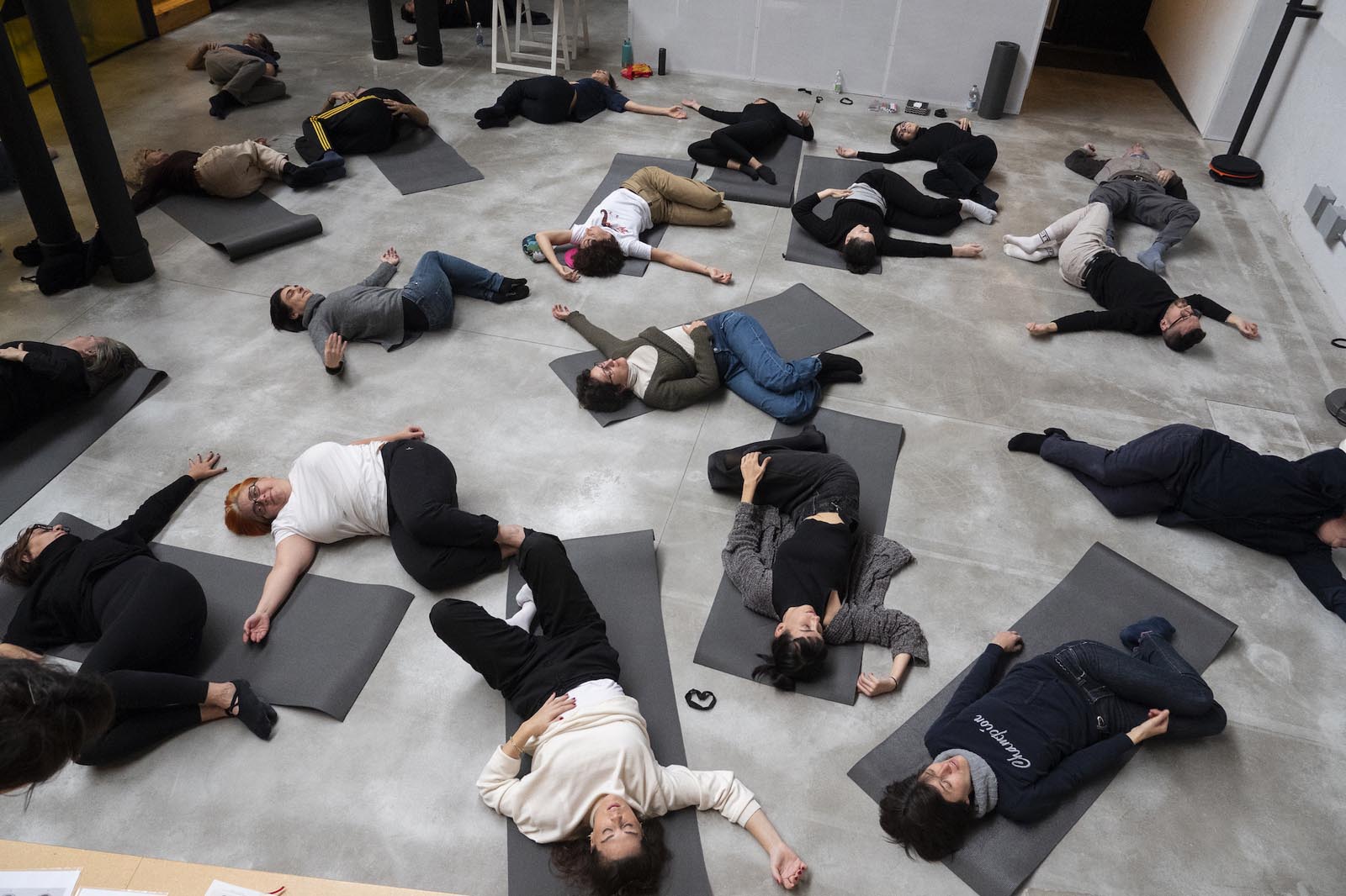 Notare che la respirazione altera lo spazio attorno, lasciarsi attraversare dalla respirazione del gruppo.