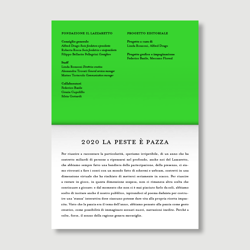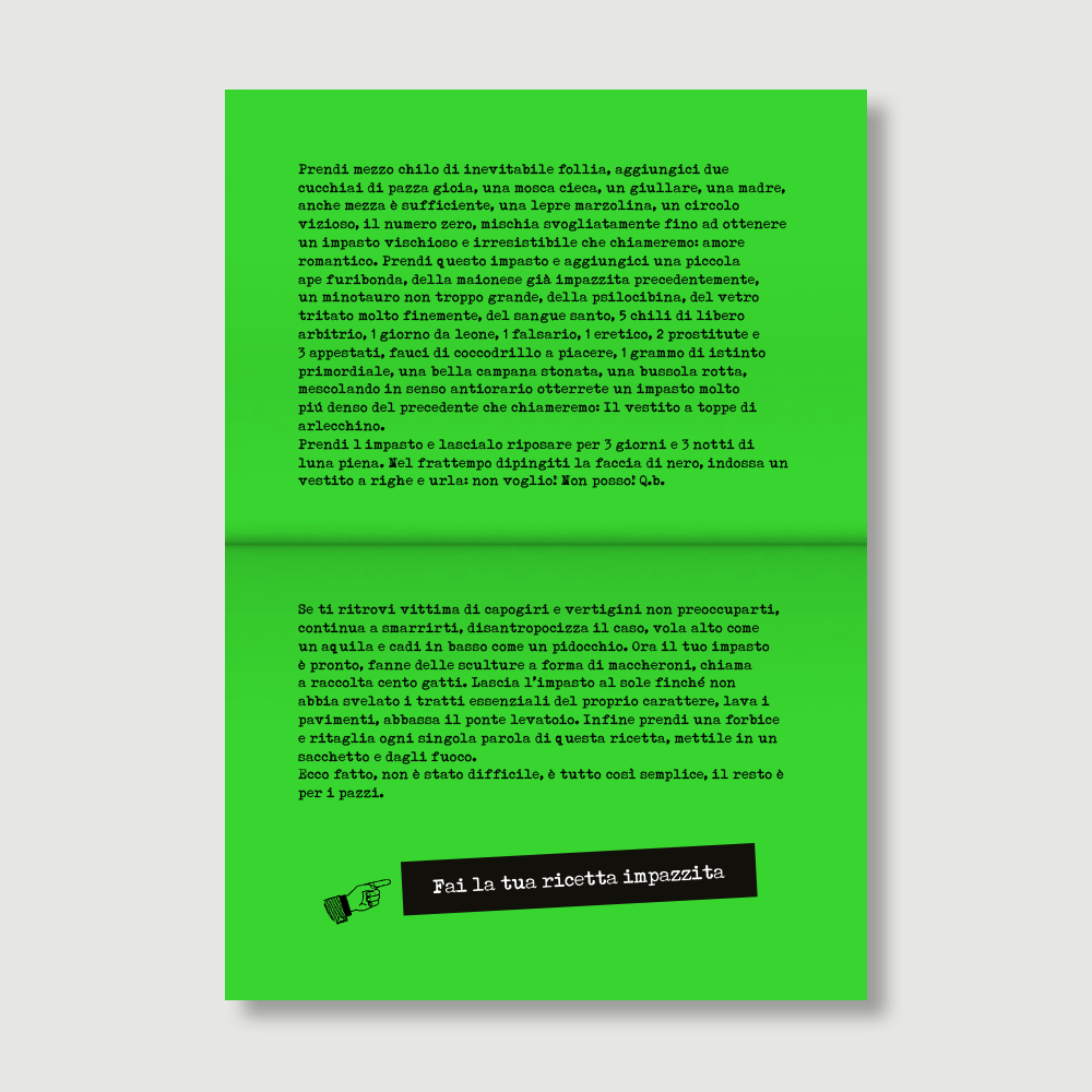 Il progetto Maionesi impazzite primo contenuto originale ideato e realizzato dal team creativo del Lazzaretto per il Festival della Peste! – nasce dall’idea di un libro che raccoglie 100 “ricette”: si tratta di poesie, definizioni, testi di canzoni, ma anche immagini, dialoghi o istruzioni per costruire folli capi di abbigliamento. Tutte suggestioni per provare a perdere la testa, ad attivare una modalità di pensiero e azioni dissennate, stravaganti, imprudenti, temerarie. Al libro, il progetto affianca una parte installativa e un ulteriore sviluppo digitale.