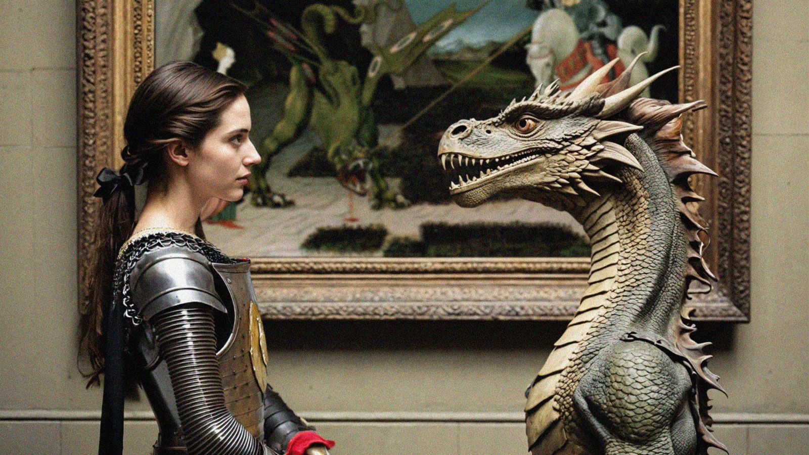 Quello che sta succedendo in questa piccola tela è che c’è una principessa, composta ed esile, di profilo, come nelle rappresentazioni tardogotiche, che tiene con un filo un drago. Lo tiene non come fosse un guinzaglio, non sta cercando di soggiogarlo, ma crea un legame, una connessione. Lei e il drago sono nella stessa storia, forse il drago è emerso da poco dalla grotta scura sullo sfondo.